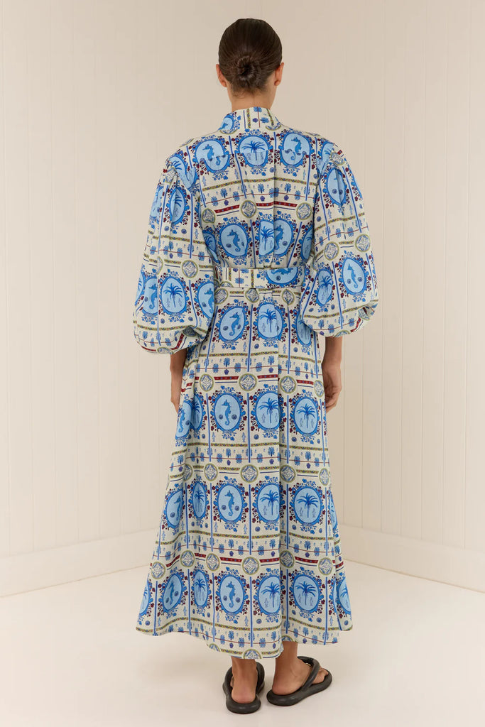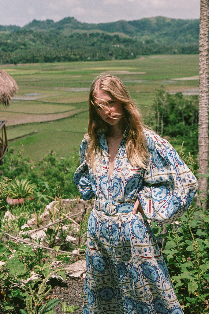 The Noddy Dress in our exclusive Lagoona Tile print is crafted in a premium Linen. The Noddy Dress is designed as a relaxed maxi dress silhouette. Featuring blouson sleeves with elasticated cuffs, a stand collar and centre front button detailing. The Noddy Dress is designed to hang loosely from the body, and has a matching buckle belt to bring in the waist.
